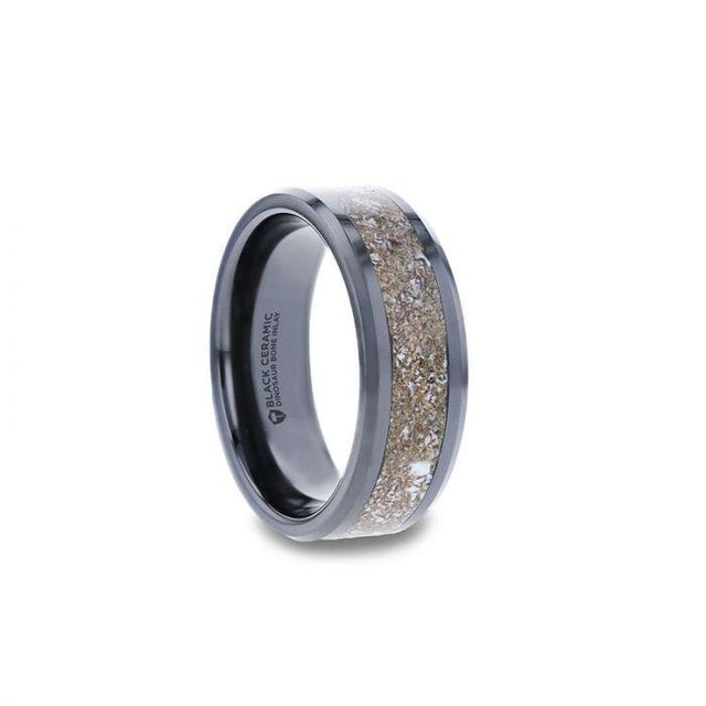 ALLOSAURUS Black Ceramic Flat Beveled Wedding Ring with White Dinosaur Bone Inlay - 8mm
