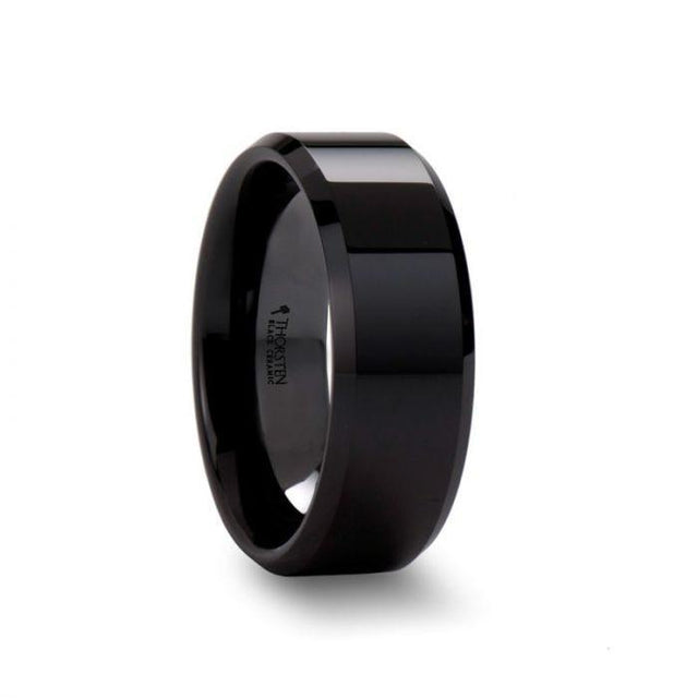 This Black Ceramic ring by Thorsten features beveled edges for everyday comfortable wear. The shiny smooth black finish of each ring gives it a beautiful bold look. These rings are made to last forever.