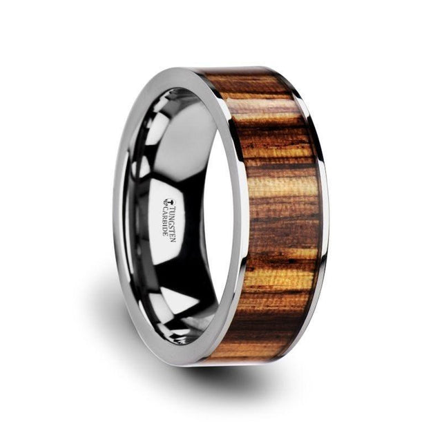 COPAN Flat Tungsten Carbide Ring with Polished Edges & Real Zebra Wood Inlay - 8mm