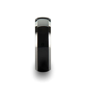 The bold and striking contemporary look of this ring by Thorsten is due to its reflective Black Ceramic domed center accentuated by contrasting silver Tungsten beveled edges.