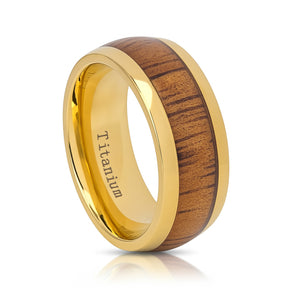 Mens Gold Titanium Dome Ring with Natural Hawaiian Koa Wood Inlay - 9mm