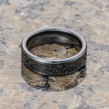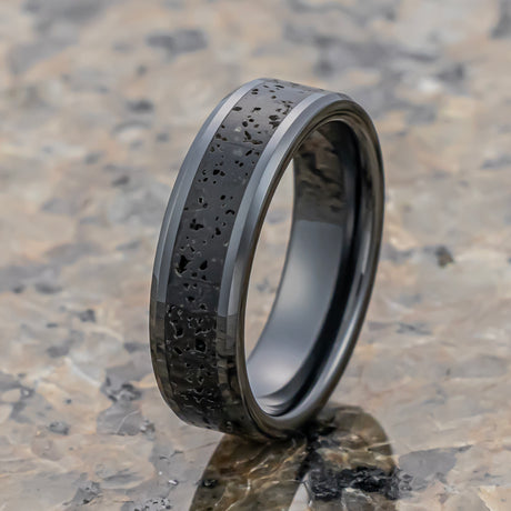 6mm Black Ceramic Wedding Band with Black Gray Lava Rock Stone
