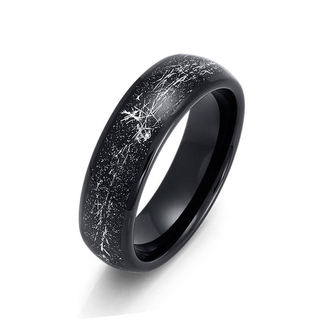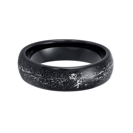 6mm Mens Black Tungsten Carbide Ring W/ Meteorite Inlay Domed Ring