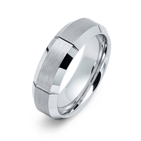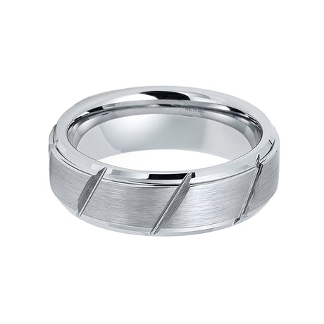 7mm - Tungsten Carbide Wedding Band W/ Diagonal Grooves, Brushed Center, Beveled Edges