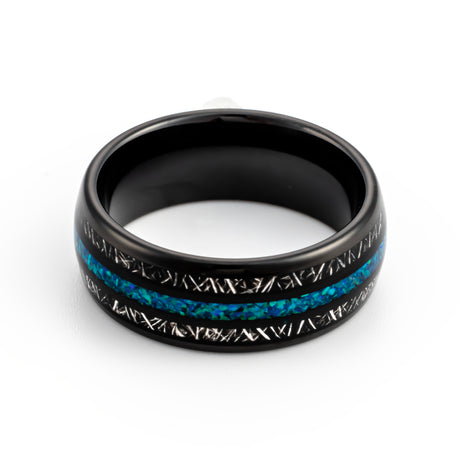 8mm - Mens Domed Tungsten Black Meteorite Ring, W/ Blue Green Opal Inlay