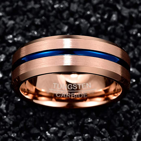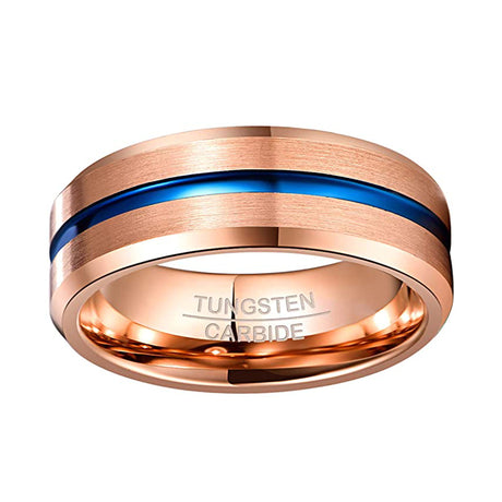 8mm - Men's Tungsten Ring, Rose Gold w/ Blue Groove, Matte Finish Beveled Edge.