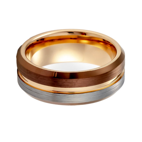 8mm - Rose gold Tungsten Ring w/espresso brown beveled edges half Brushed wedding band