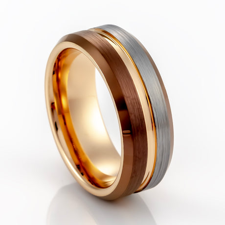 8mm - Rose gold Tungsten Ring w/espresso brown beveled edges Brushed wedding band