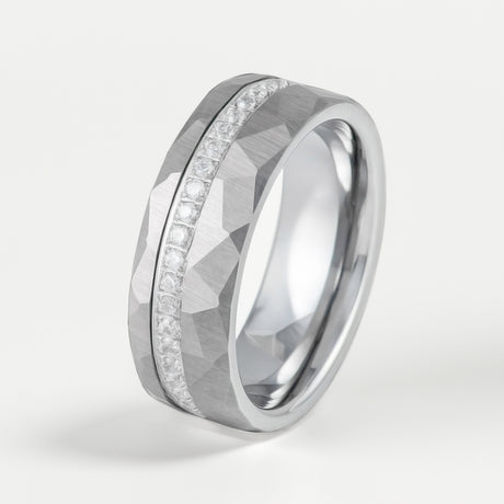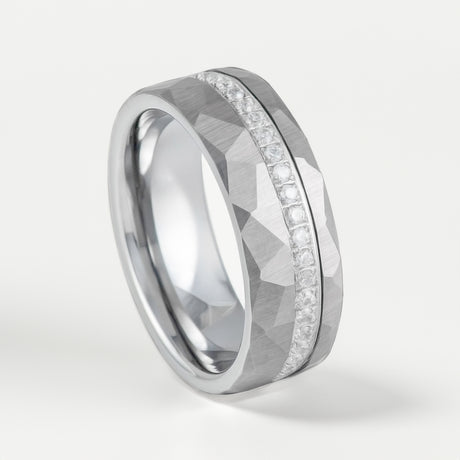 8mm - Silver Tungsten Hammered Wedding Band with Off-center Eternity Diamonds