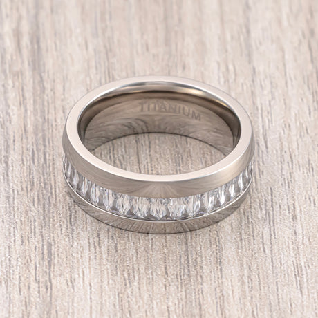8mm - Silver Titanium Wedding Band W/ 7 Ct CZs Diamond Emerald Cut Inlay