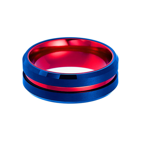 8mm - Royal Blue & Red Groove Tungsten Wedding Band Beveled Edges