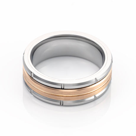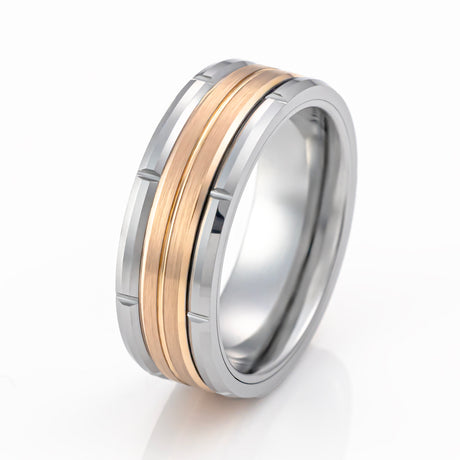 8mm - Silver Tungsten Wedding Band Rose Gold Brush Grooved Center,