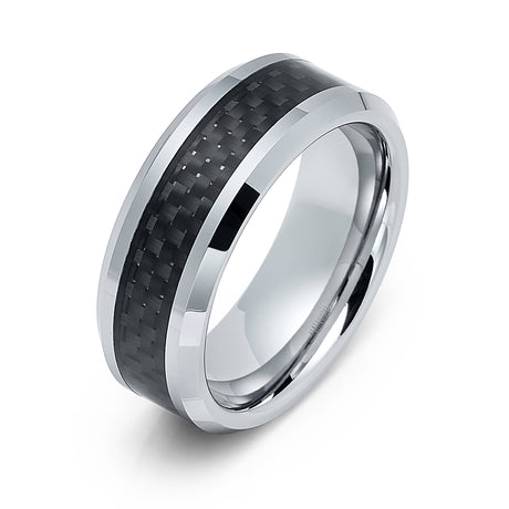 8mm - Silver Tungsten Wedding Band Black Carbon Fiber Inlay Ring