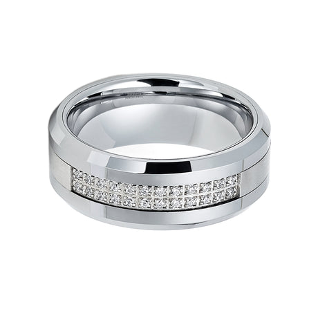8mm - Silver Tungsten Wedding Band Double Row W/ 24 CZs Diamond Inlay