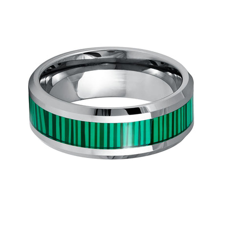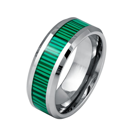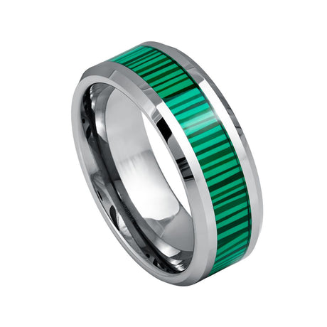 8mm - Tungsten Carbide Ring W/ Faux Malachite Inlay Beveled Edges Wedding Band