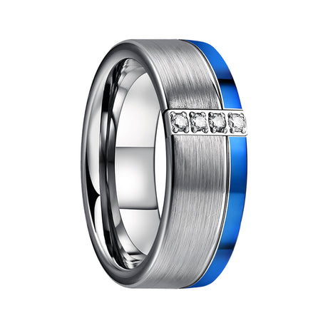 8mm - Silver Tungsten Wedding Ring with Blue Edge with 4 Cubic Zircon Diamonds