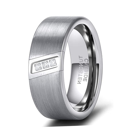 8mm - Silver Tungsten Wedding Ring, Brushed Finish, 3 Cubic Zircon Diamonds