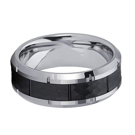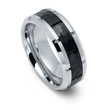 8mm Black Hammered Tungsten Carbide Wedding Ring with Beveled Edges