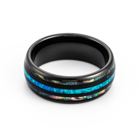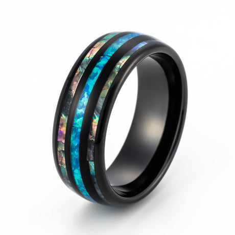 8mm- Polished black Tungsten Dome Ring W/ Blue Opal Inlay Between Two Abalone Inlays