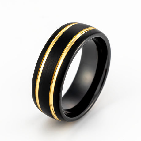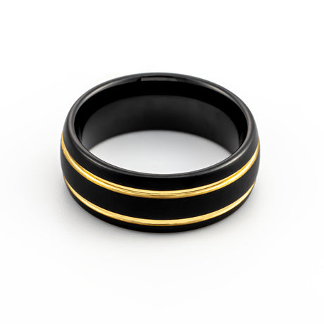 8mm- Black Tungsten Carbide Dome Ring w/ Two Yellow Gold Grooves