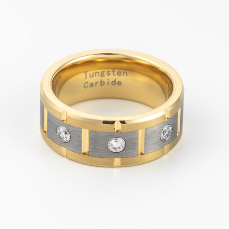 8mm- 14k Gold & silver brushed center Tungsten Carbide ring w/ 3 CZ Diamonds inlaid groove