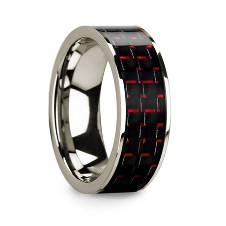 Mens 14k White Gold Flat Wedding Band with Black & Red Carbon Fiber - 8mm