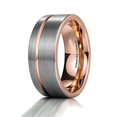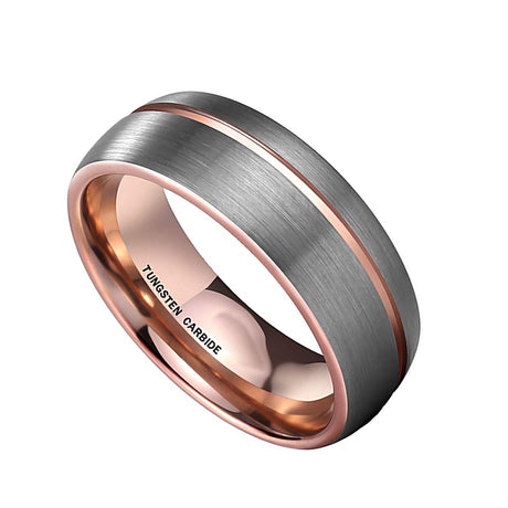 Rose Gold Tungsten Band, Brush Center, Off Center Rose Gold Groove Ring - 8mm