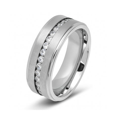 Silver Titanium Ring Brushed Full Eternity White CZ Diamonds Stepped Edges 8mm
