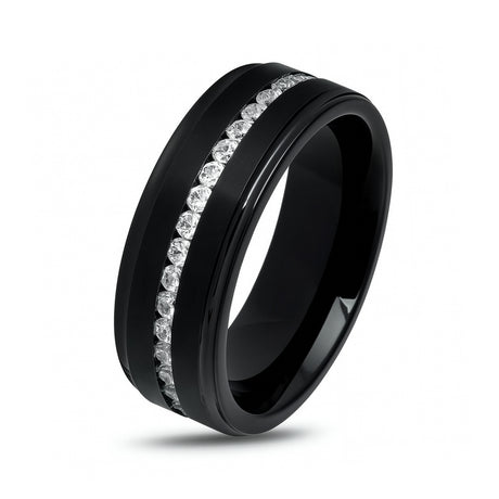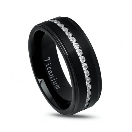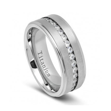 Silver Titanium Wedding Band W/ 9 Channel Set CZ Diamond Beveled Edges 8mm