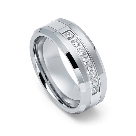 Silver Tungsten Band High Polished with Prong set With 7 Round CZs- 8mm