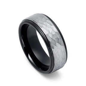 8MM BLACK TUNGSTEN WEDDING BAND, SILVER HAMMERED BRUSHED CENTER