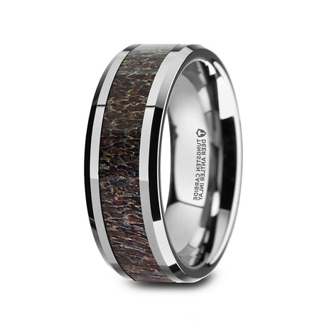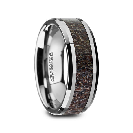 8mm - Tungsten Wedding Band, Dark Antler Inlay Ring Polished Beveled Edges