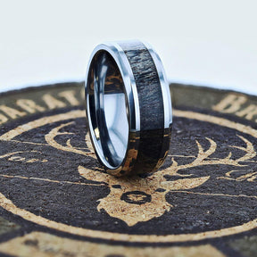 8mm - Tungsten Wedding Band, Dark Antler Inlay Ring Polished Beveled Edges