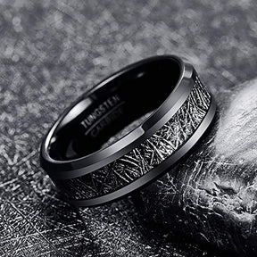 8mm - Tungsten wedding Rings W/ Black Meteorite Inlay Beveled Edges