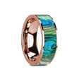 This 14K rose gold wedding band is inlaid with extremely popular Mother of Pearl inlay. Mother of Pearl is commonly found in abalone and is known for it's brilliant array of colors. The real shell is inlaid into the center of a 14K polished rose gold band. This comfort fit wedding ring is ideal to symbolize your love commitment and is available in an 8 mm width.