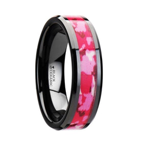 This beautiful pink camo themed new style from our camo black ceramic wedding bands line is made of durable black ceramic. This unique design is a perfect matching of rugged black ceramic and pink camo. The camouflage design used consists of different shades of pink and white. This beautiful wedding band has beautifully polished beveled edges and the inlay is made of pink and white camouflage.