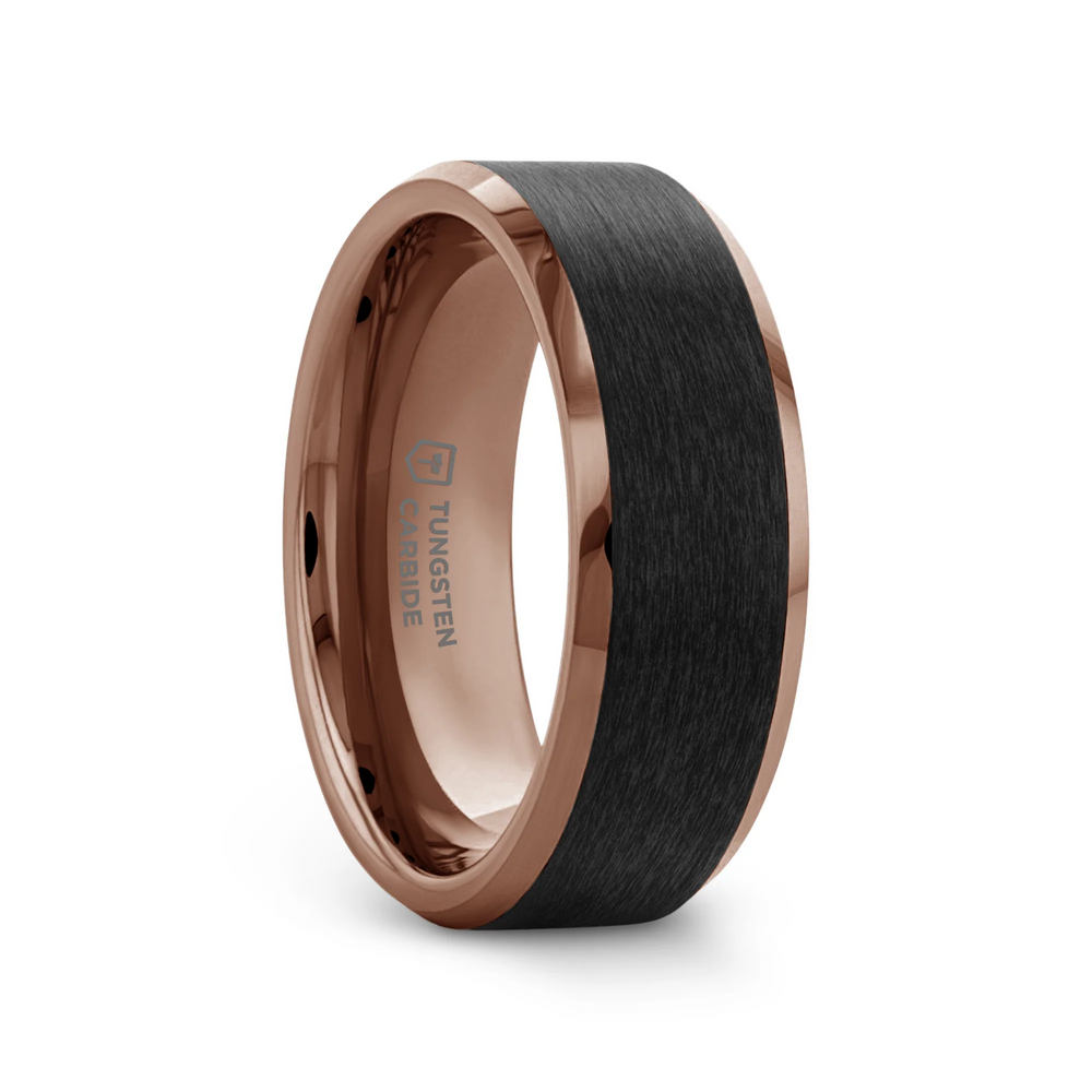 Crafted from sturdy tungsten, the FERROS ring showcases an elegant espresso plating with a polished beveled edge. The 8mm band features a striking brushed black center, creating a refined contrast that exudes timeless sophistication. Durable and stylish, this ring is an excellent choice for those who appreciate modern craftsmanship with a touch of classic charm.