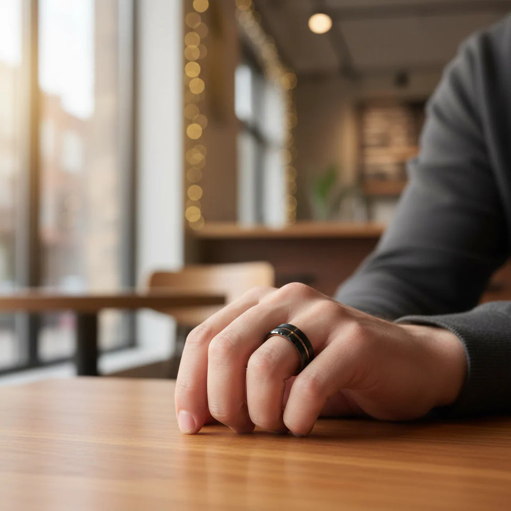 Crafted with expert precision, the NEVAN Flat Brushed Black Tungsten Men's Wedding Band features a sleek espresso groove center for a modern touch. Made of black tungsten, it offers exceptional durability and a lightweight feel. Perfect for stylish grooms who value quality and sophistication. Available in an 8mm width.