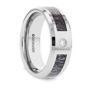 This beautifully polished and beveled Titanium ring by Thorsten features an inlay of ombre deer antler with highlights of dark brown and gray tones and a distinctive round-cut White Diamond. A perfect option those who love the outdoors!