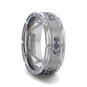COURAGEOUS Brushed Center Titanium Men's Wedding Band With Double Grooved Polished Edges And Black Diamond Settings - 8mm