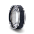 A volcano that now sits dormant on your finger. This stylish and handsome Titanium mens wedding band has glossy, polished edges with bevels. Its the inlay that takes center stage, however, with a mashup of black and gray lava rock. It looks as if a channel of lava once flowed through the band, only to harden, leaving it in its current state. The ring is available in 8mm widths and several sizes.