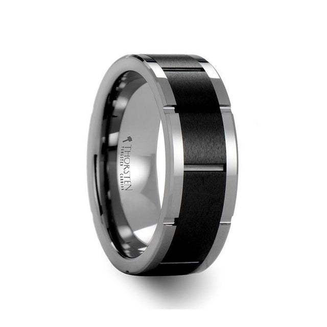 This classic watch band style Tungsten Carbide ring by Thorsten features periodic horizontal grooves. This rings center is inlaid with a brushed-finish Black Ceramic and also has horizontal grooves.