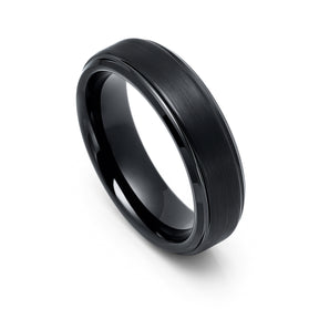 6mm - Mens Tungsten Wedding Band, Polished Stepped Edges, Brushed Flat Center - 5 / Black / Tungsten Carbide is backordered and will ship as soon as it is back in stock.