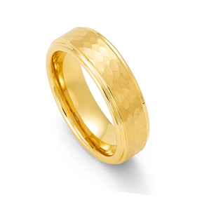 6mm - Yellow Gold Tungsten Hammered Wedding Band Stepped Edges Brush Center