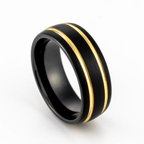8mm- Black Tungsten Carbide Dome Ring w/ Two Yellow Gold Grooves