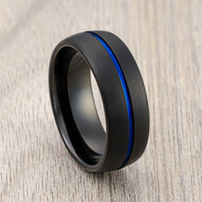 8mm Mens Black Tungsten Carbide Ring With Blue Groove Brushed Center Dome