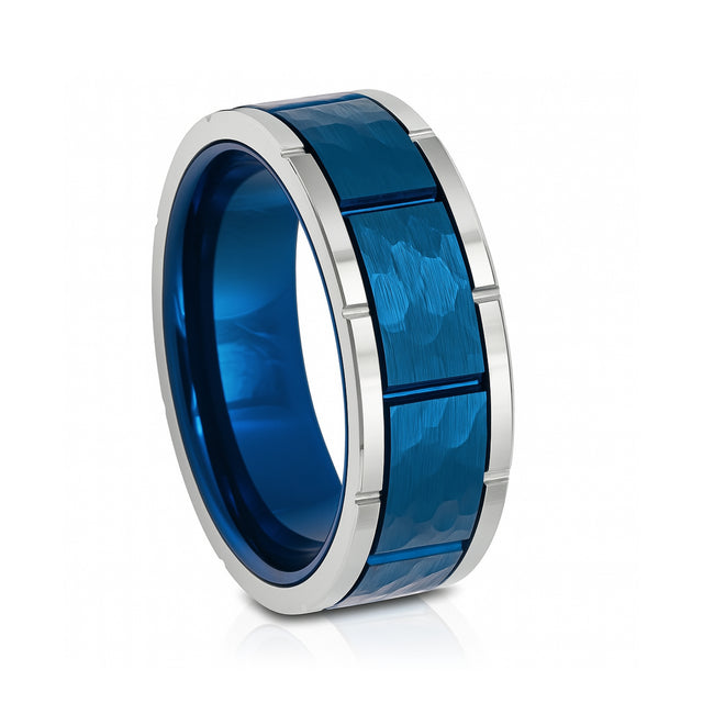 Hammered Blue & Silver Tungsten Carbide Ring,