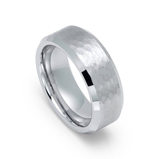 8mm Silver Tungsten Carbide Hammered Wedding Ring Beveled Edges