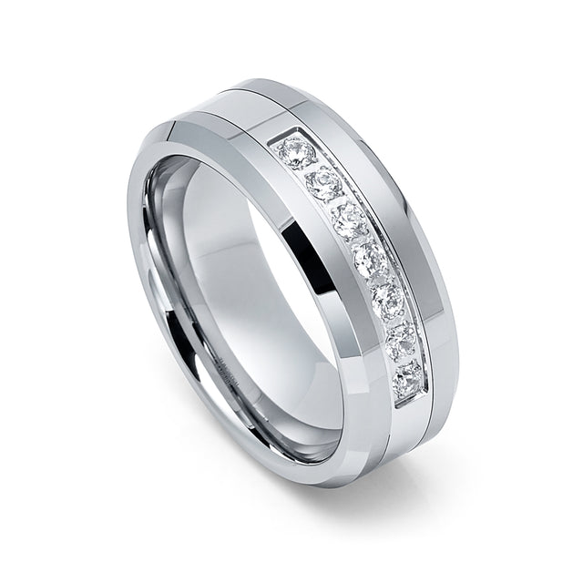 8mm - Silver Tungsten Wedding Band W/ 7 CZ Diamond Inlay High Polish