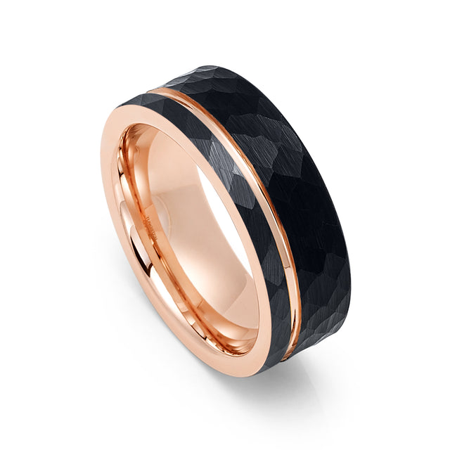 8mm Hammered Black Tungsten Carbide Wedding Band with Rose Gold Groove